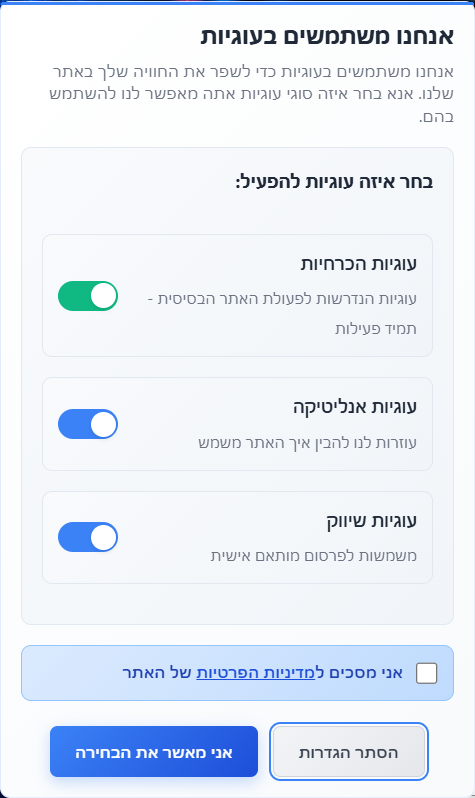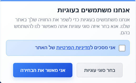 התקנת רכיב באתר המציג הודעה קופצת לגולשים עם כניסתם לאתר ומבקש את אישורם לשימוש בקובצי Cookie. התוסף מאפשר להם לבחור אילו סוגי קובצי Cookie לאשר (כפי שניתן לראות בצילומי המסך שצירפתם).
